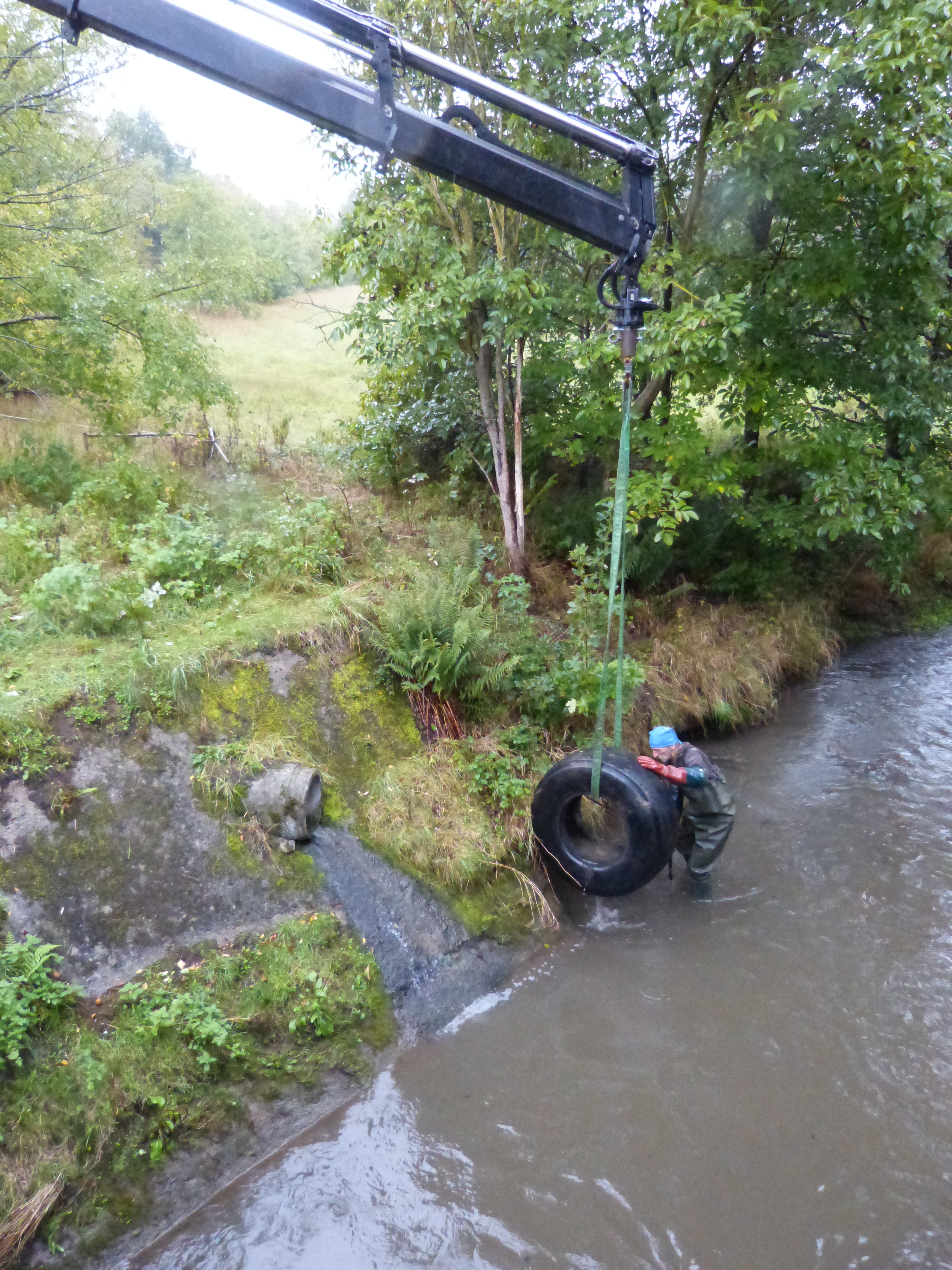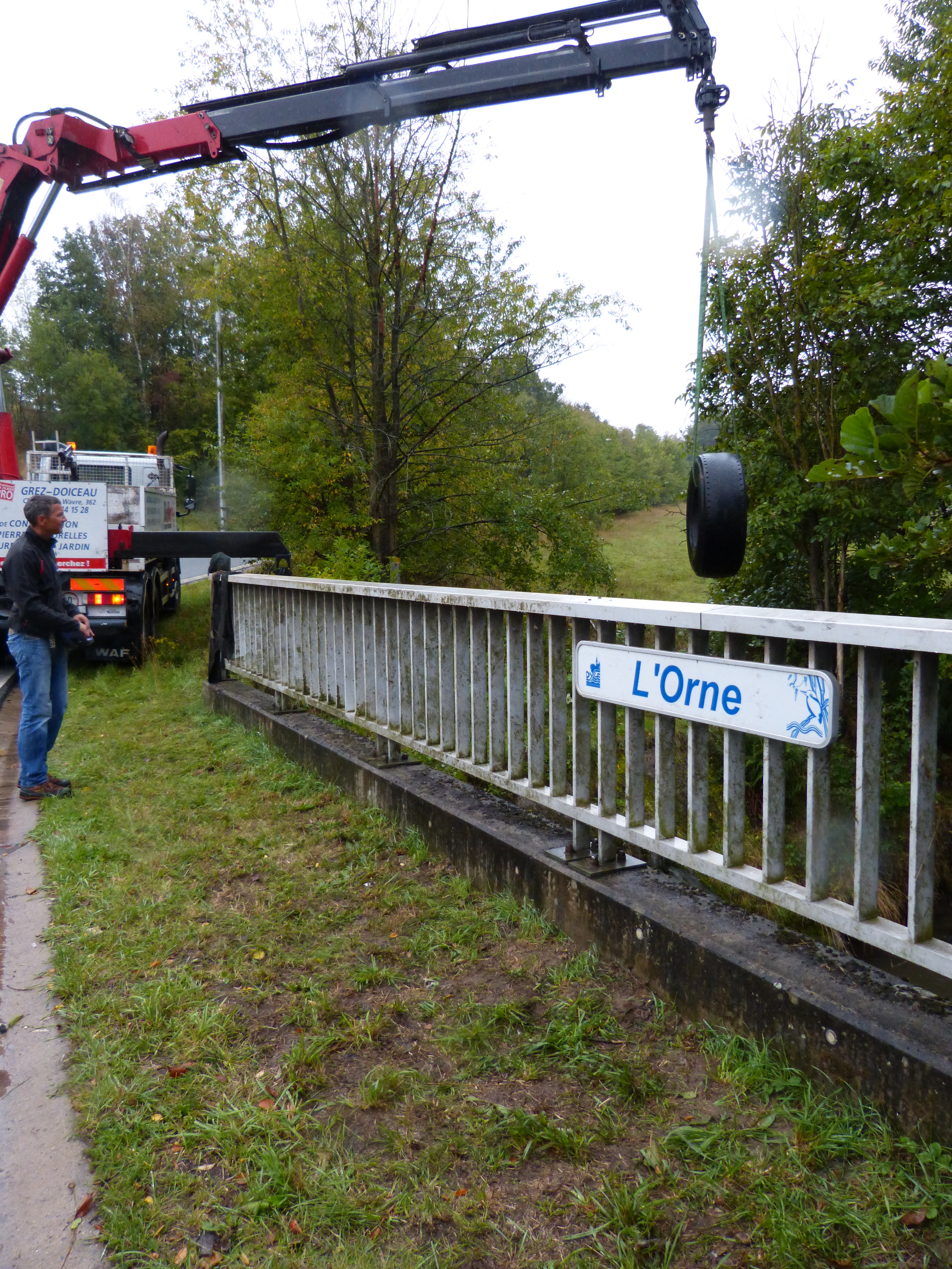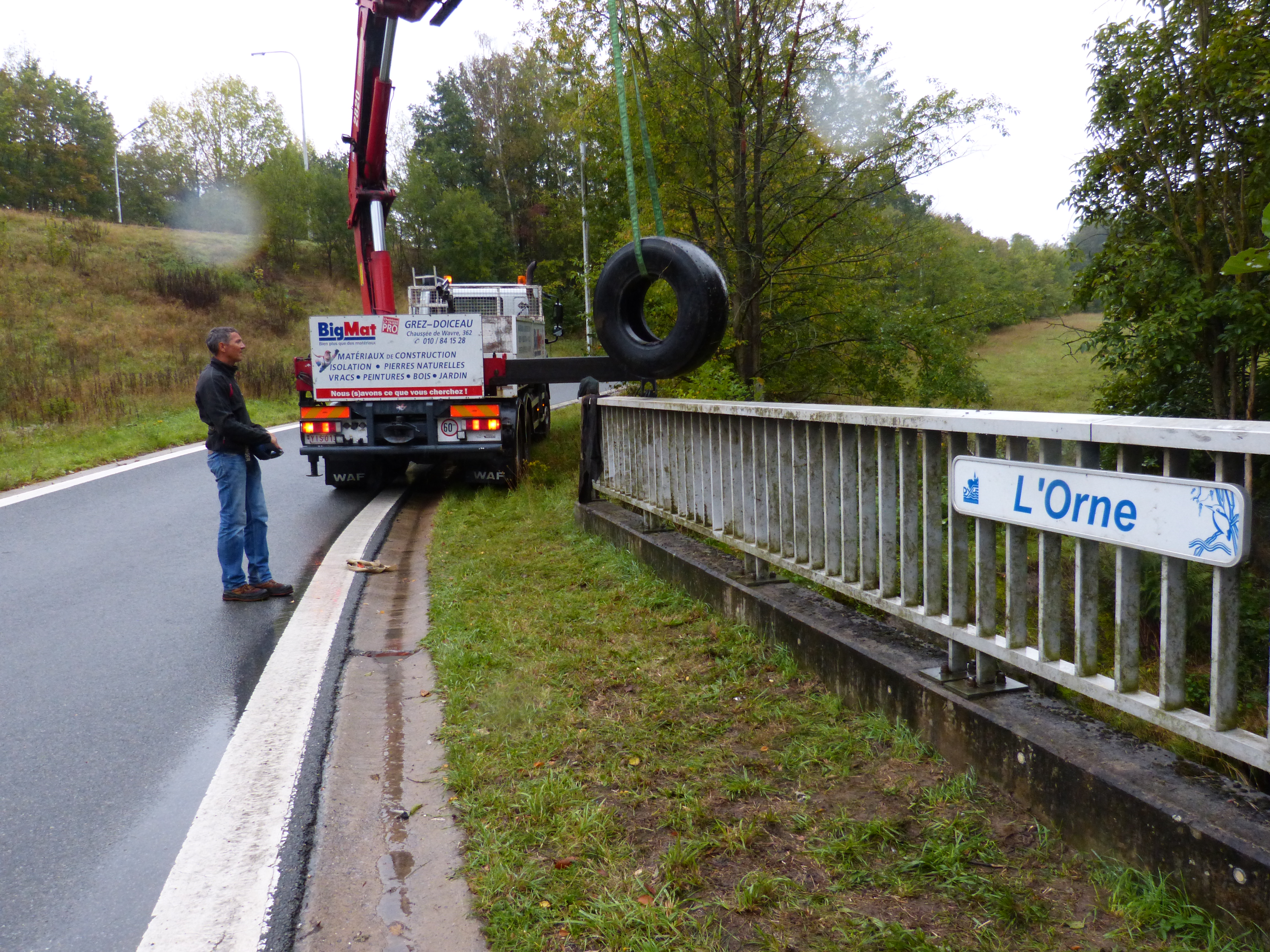 Une histoire de pneu de camion en trois temps… extraction du lit. Séjour sur berge puis transport par bateau sur 250m pour un court séjour, bien arrimé en attendant l’évacuation…