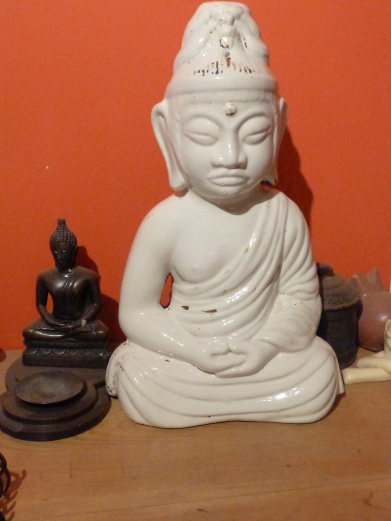 Enfin, le Bouddha boudeur, passé au bain, a trouvé sa place à la maison 🙂