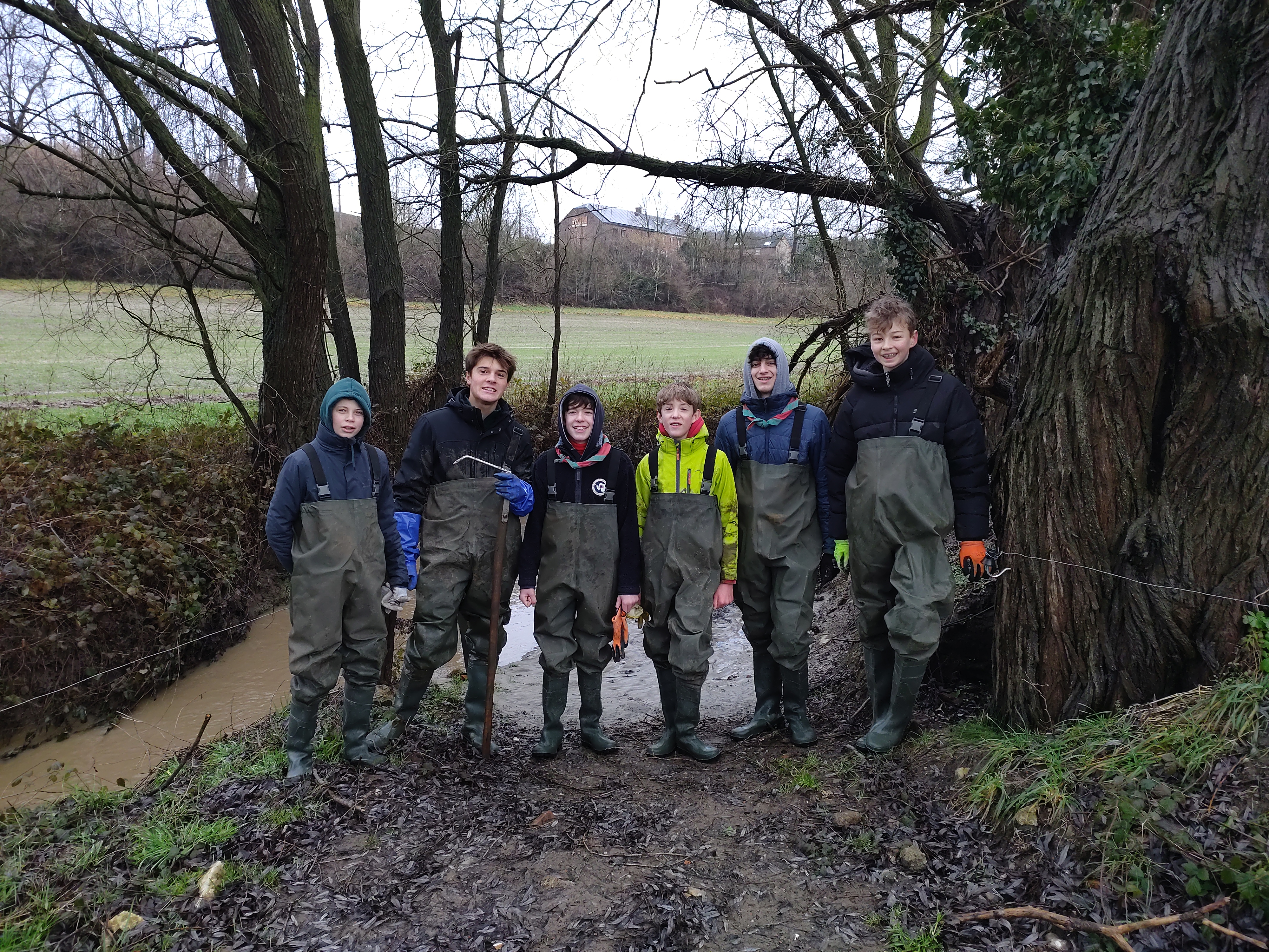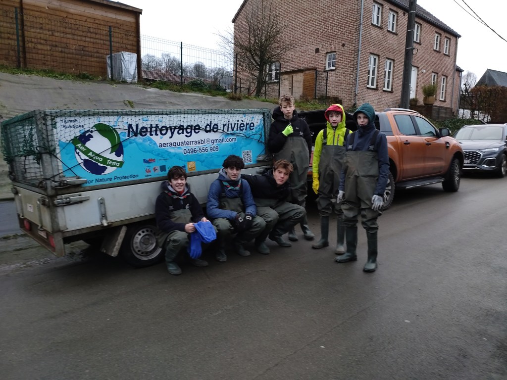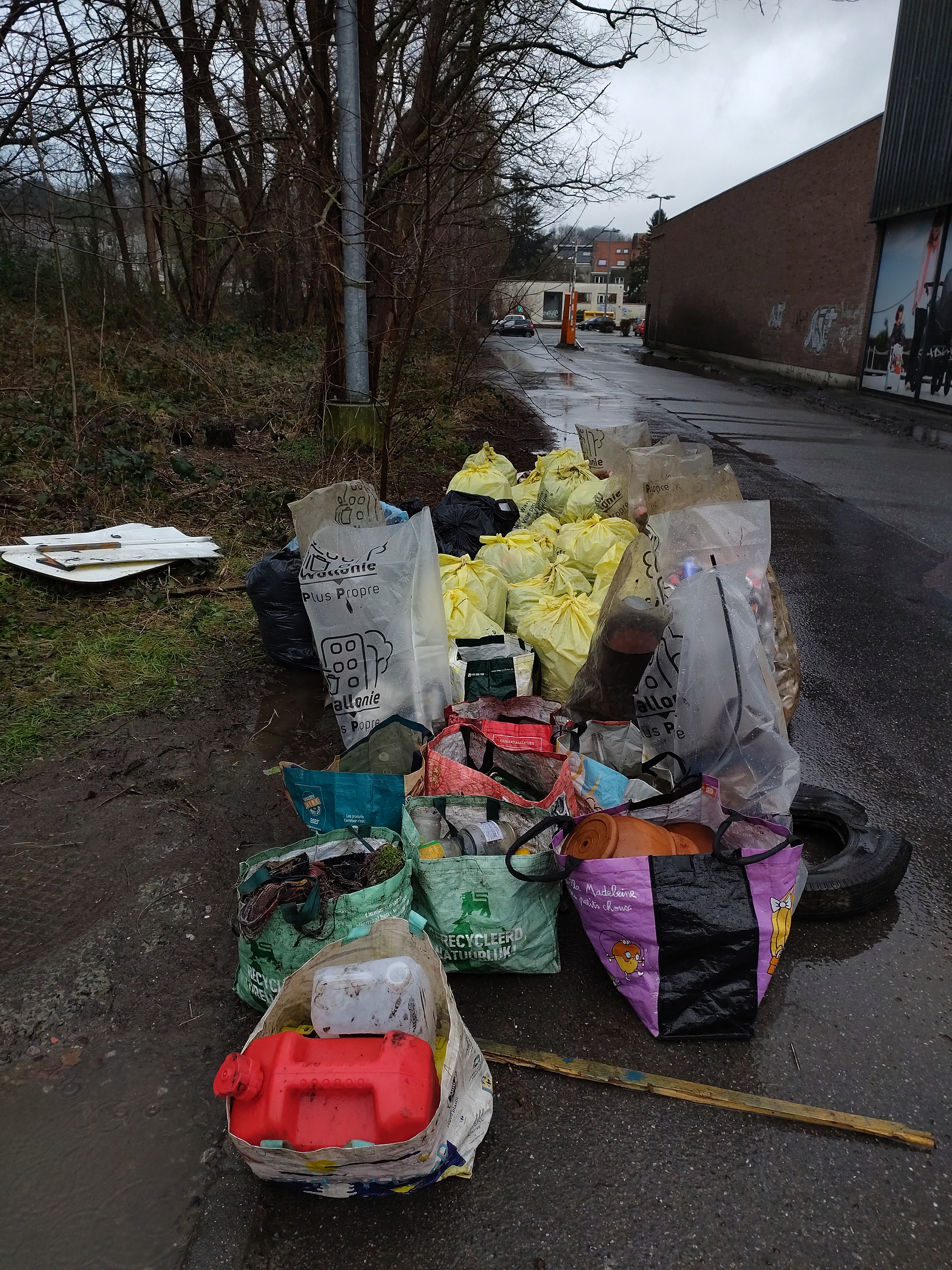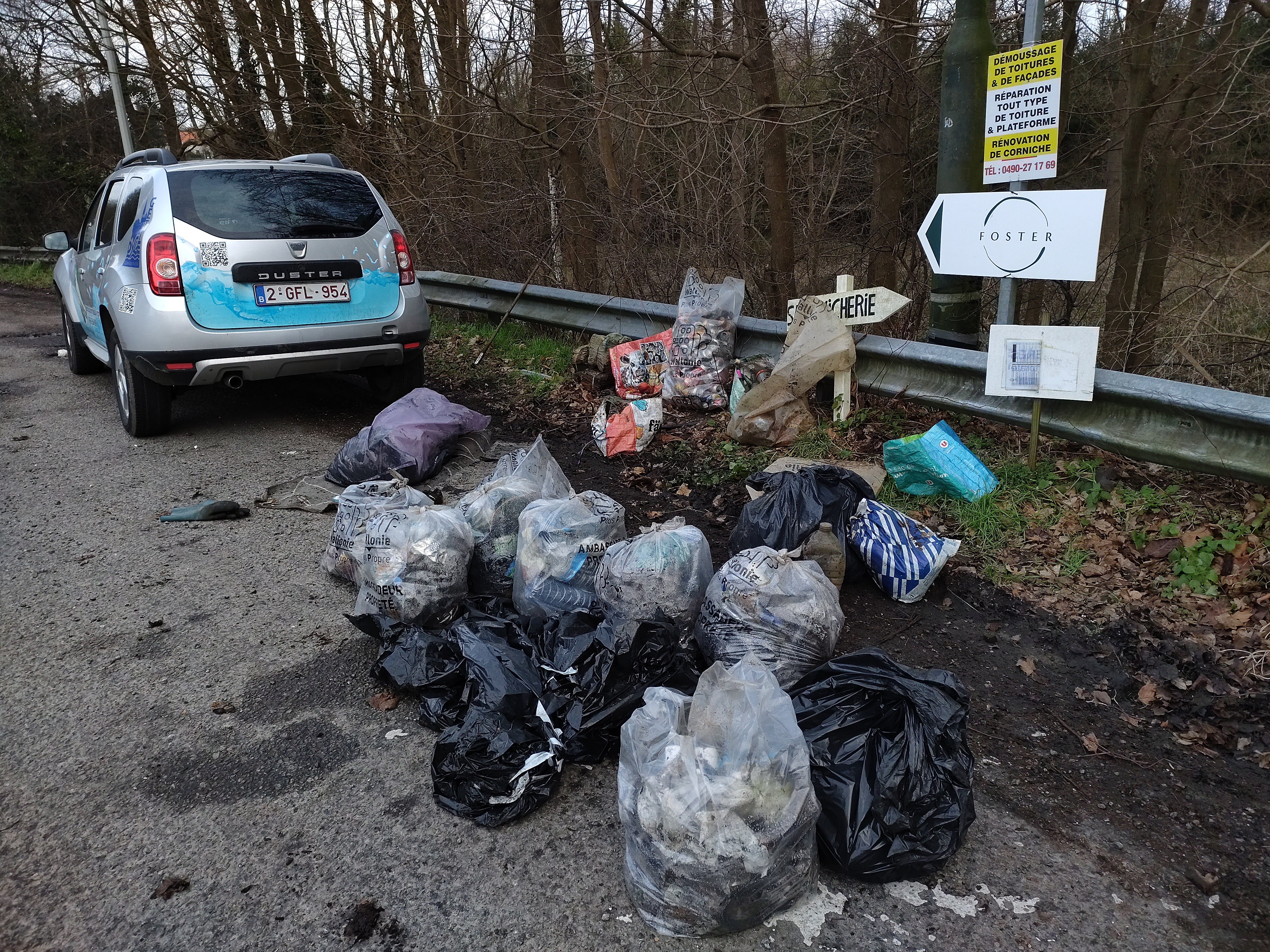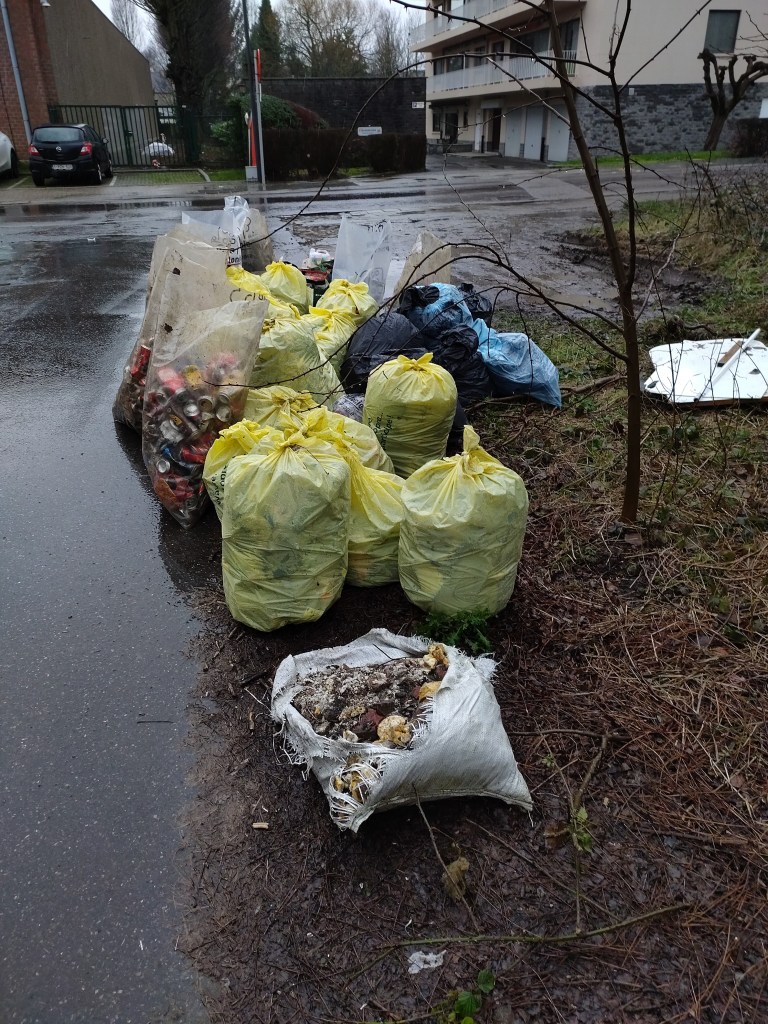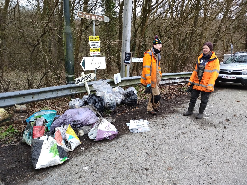 C’est chose faite. Nous avons déjà le renfort des Scouts de Bossut et malheureusement aussi celui de la pluie. Les déchets sont très vite rapatriés vers une voie carrossable.