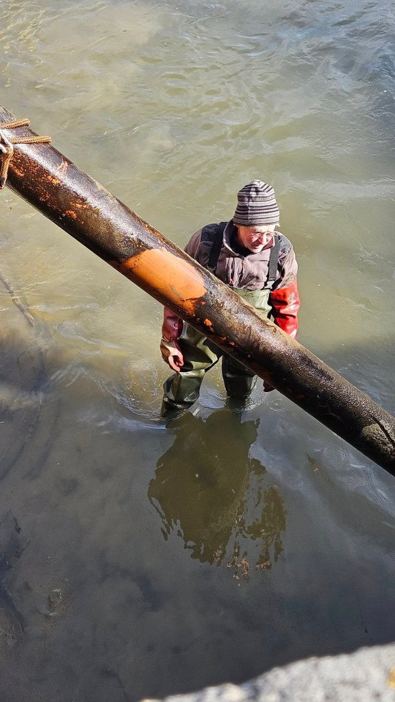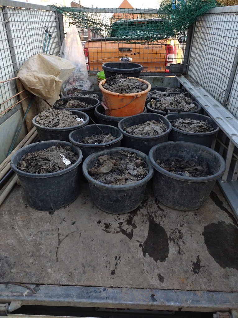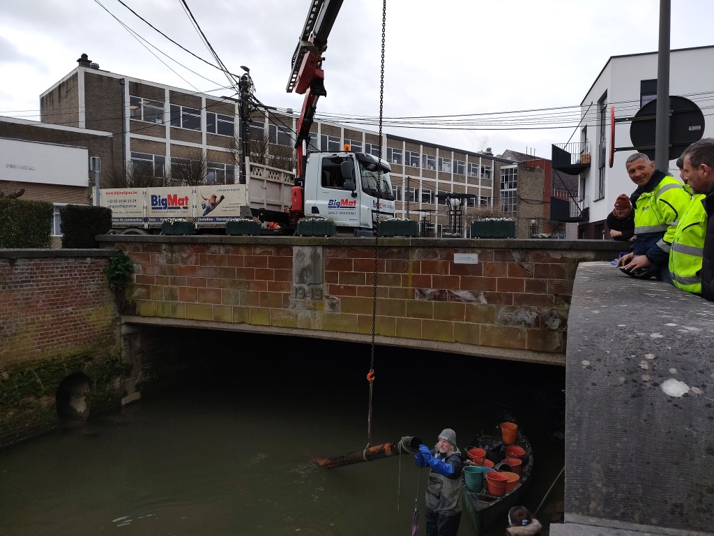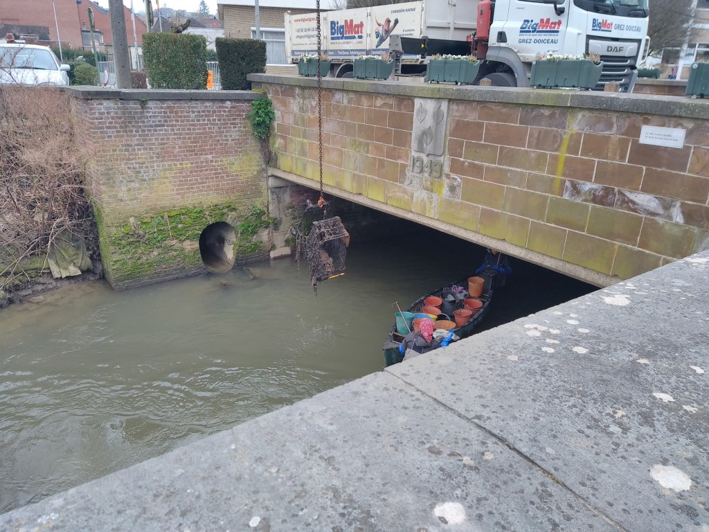 Nous travaillons de l’aval vers l’amont, ainsi nous commençons par la sortie du pertuis. Très vite nous voyons et sentons sous nos pieds la tâche qui nous attends. Rive gauche, une très longue dune composée de sable dur comme du béton, de branches, le tout bien figé par les déchets. Ainsi, une fois les déchets sortis, le sable et le bois deviennent libres. Comme il y a trop de bois, dont certains très grand, le rendez-vous est pris avec le service technique de la ville pour l’évacuation. Nous faisons appel à BigMat Grez-Doiceau pour l’extraction mécanisée d’un caddie et d’un tuyau pvc évacuation d’eau de 5 mètres de long (nous en aurons 3).
