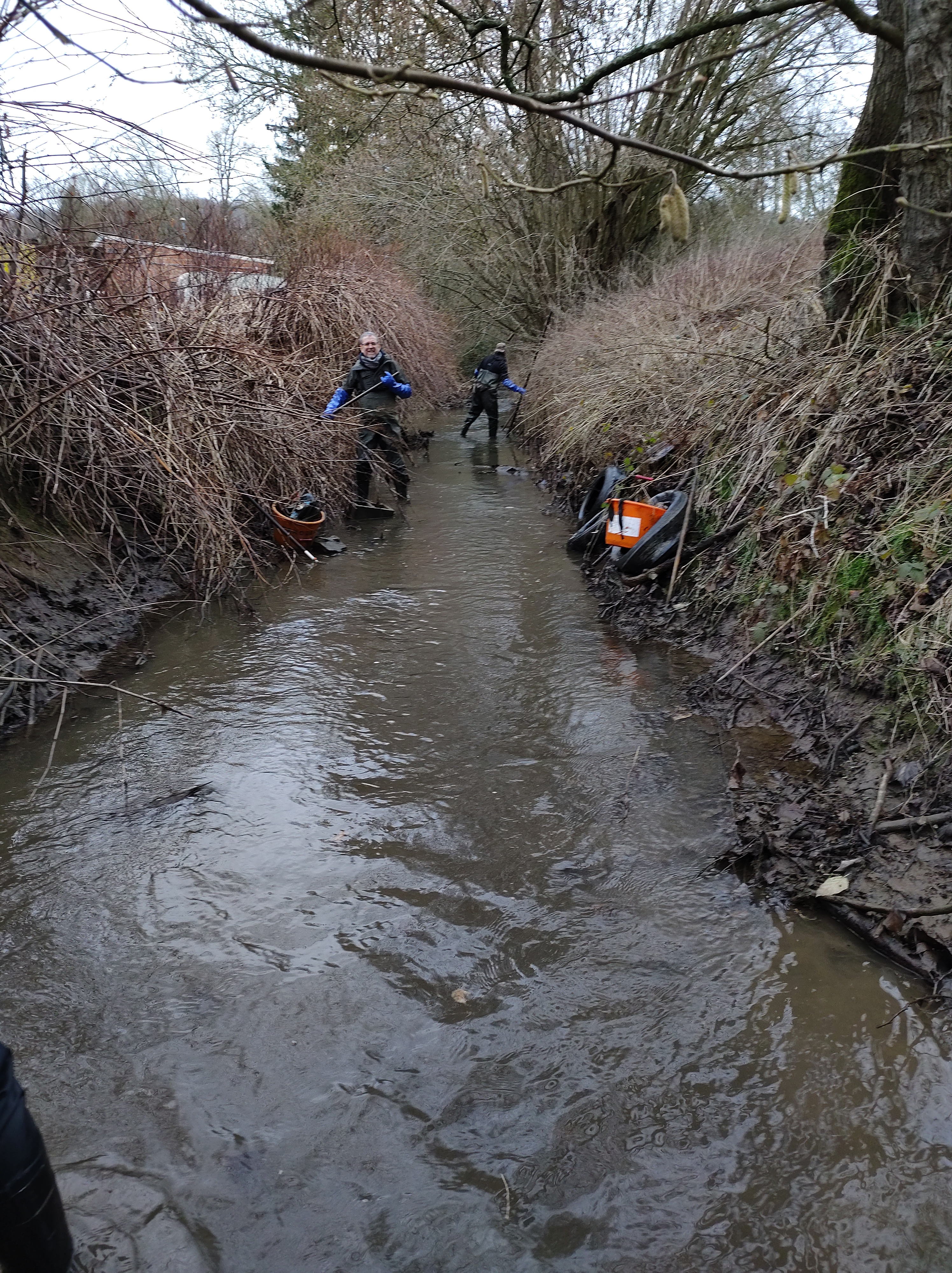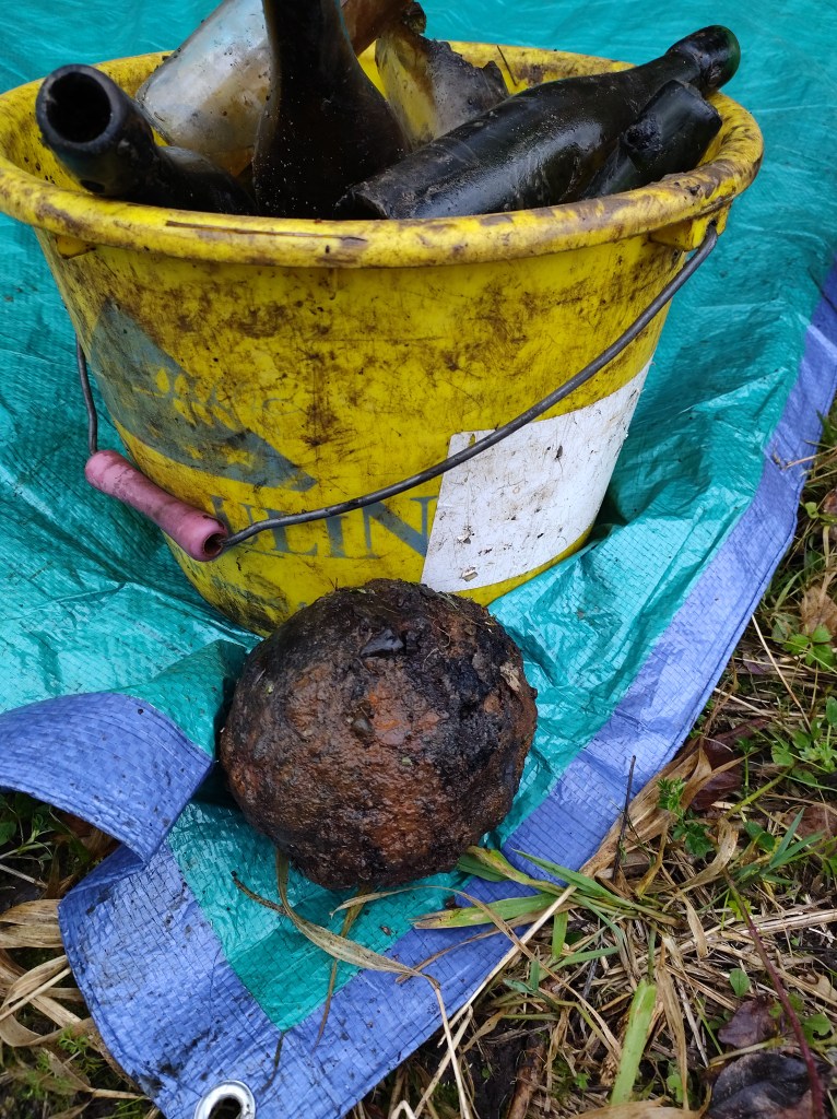Même constat que dans nos chères rivières… Des très vieux déchets au fond de l’eau. Par contre, la nature du substrat est très différente de chez nous, en effet, ici il s’agit principalement de roches et d’argile, chez nous il s’agit principalement de sable. Dès lors l’extraction et le rinçage des déchets est plus difficile et demande plus d’huile de coude ! D’autre part, Le Houyoux ne nous permet pas d’utiliser un de nos bateaux.