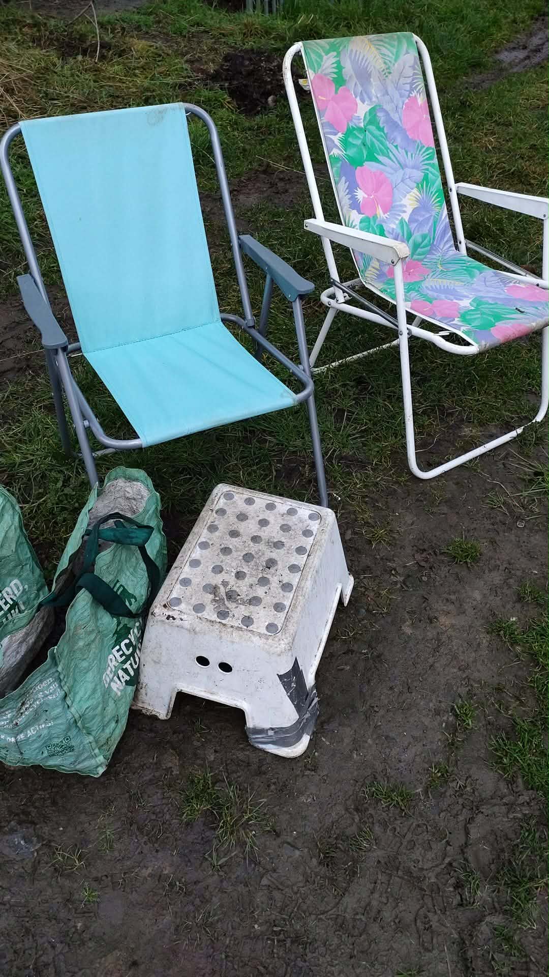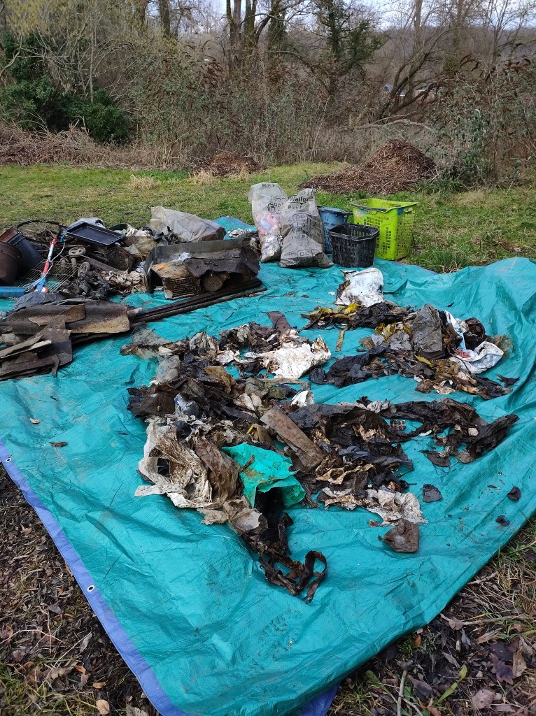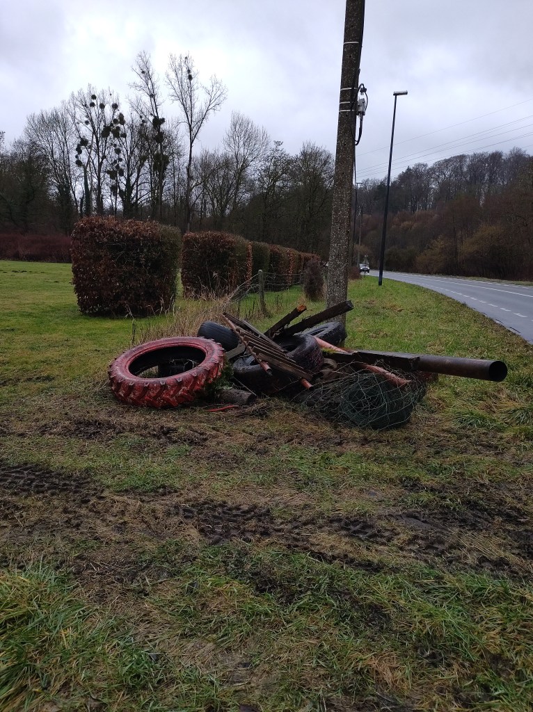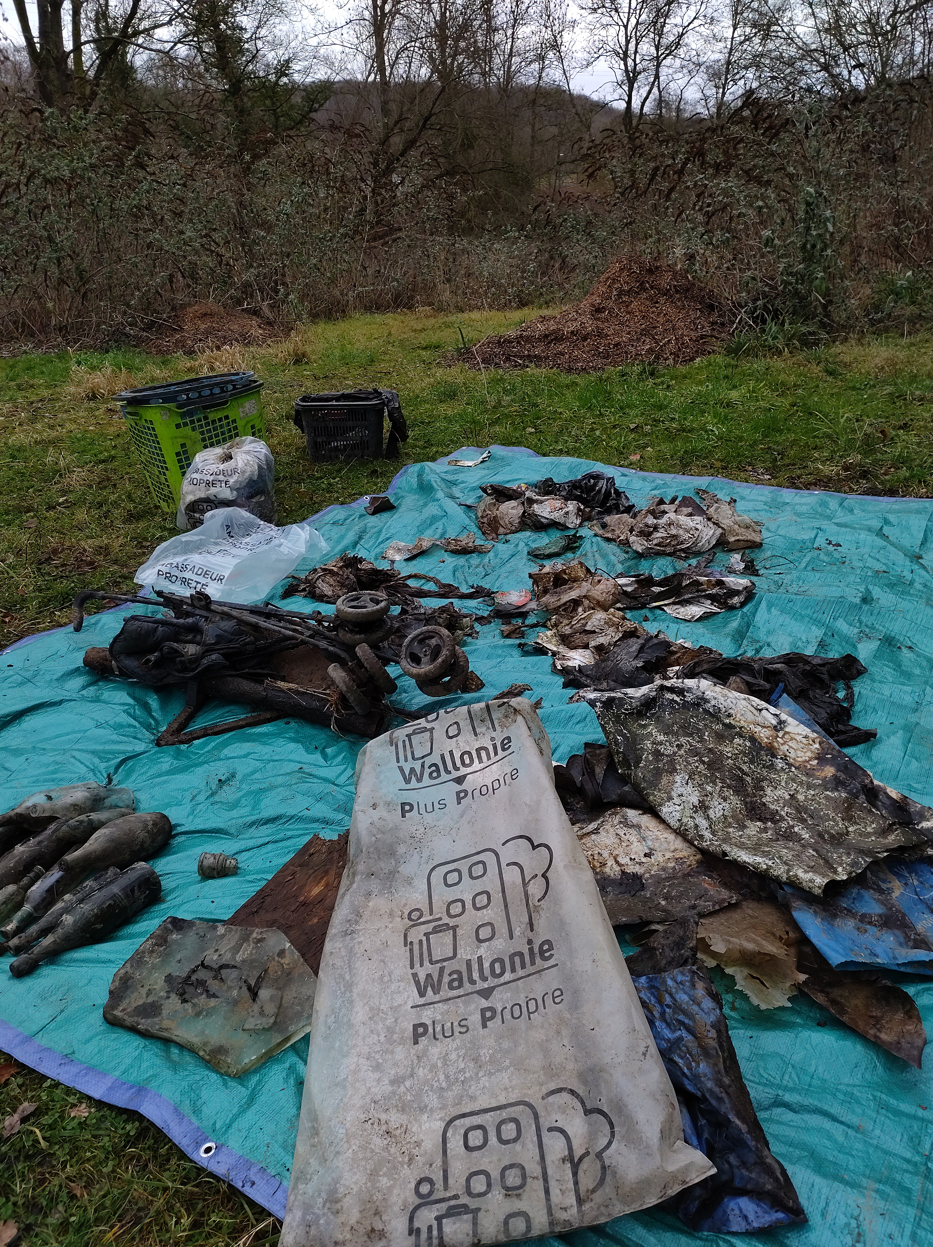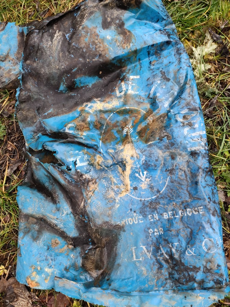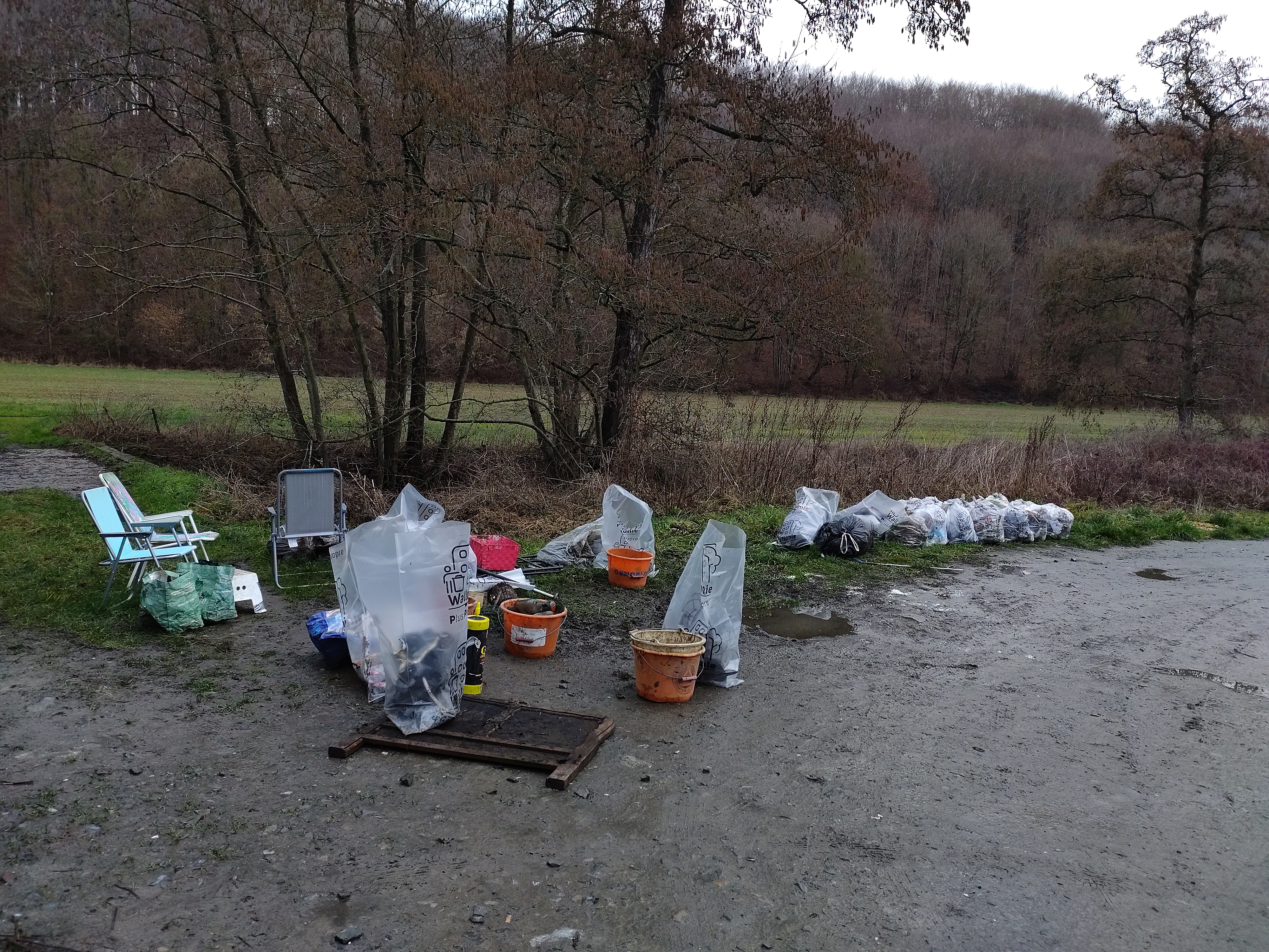 Les grosses pluies nous empêchent de retourner dans l’eau, la petite rivière se refuse à nous ! Nous nous rabattons sur les bords de route de la Rue de Gembloux… il y avait là de nombreux déchets visibles et tout autant de vieux dépôts plus loin dans la végétation non loin de la rivière. De quoi bien nous occuper ! Cependant nous y trouvons largement de quoi faire une super pause avec le mobilier 🙂
